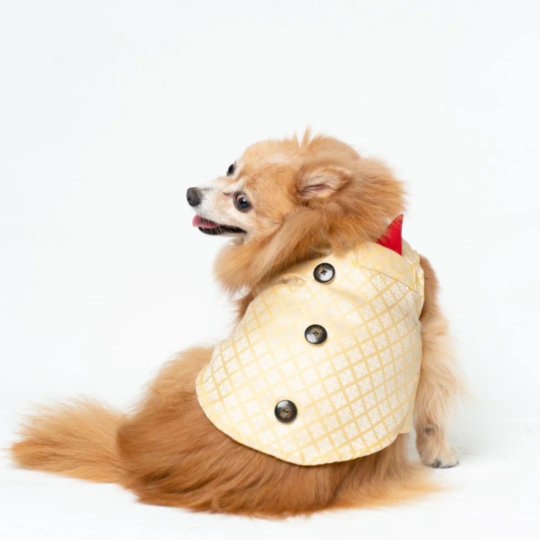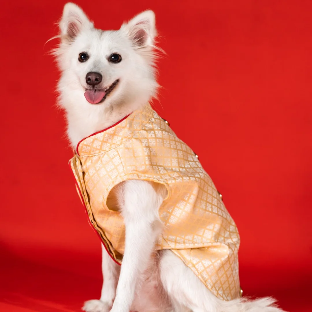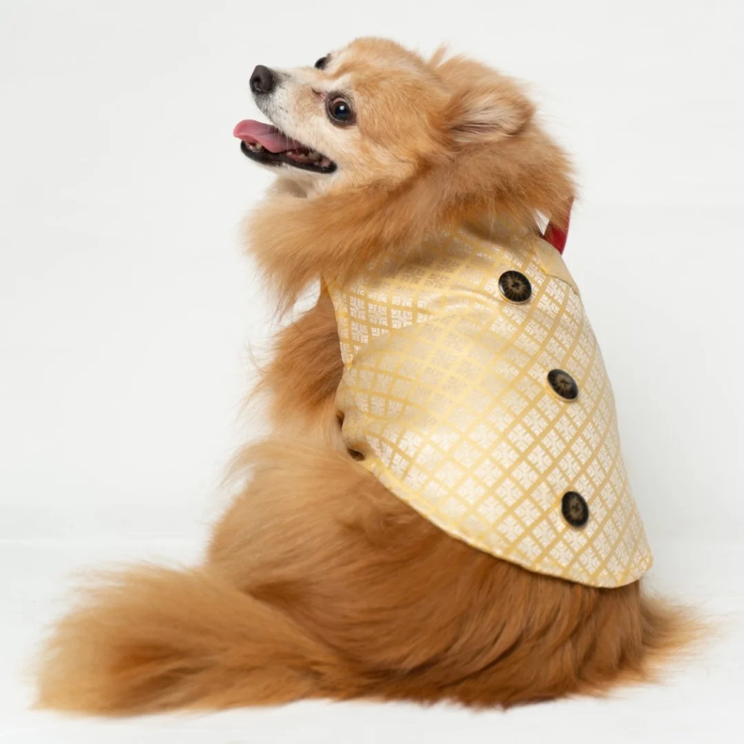 Dress your furry friend in royal elegance with our Golden Dog Sherwani – a perfect choice for weddings, festivals, and special occasions! This regal outfit is tailored with traditional fabric and intricate detailing, giving your pup a stylish and cultural flair that turns heads and warms hearts.